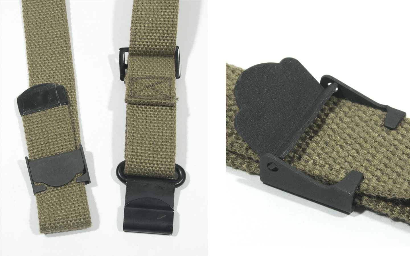 複雑怪奇な1923スリング、M1 スリング戦中型、同スリング戦後型です。写真右側にバックルの裏側と取っ手側を掲載しています。右が戦後タイプです。