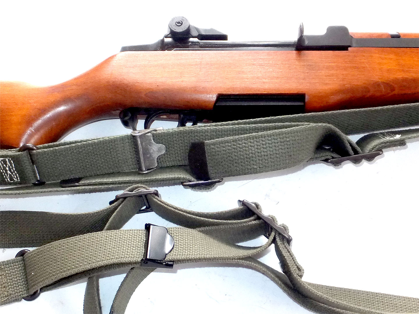 写真左のガランド・スリングは、時代順に1907スリング初期の真鍮金具、同スリング後期のスチール金具、