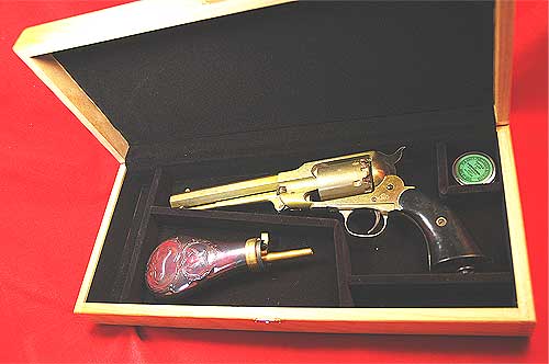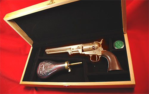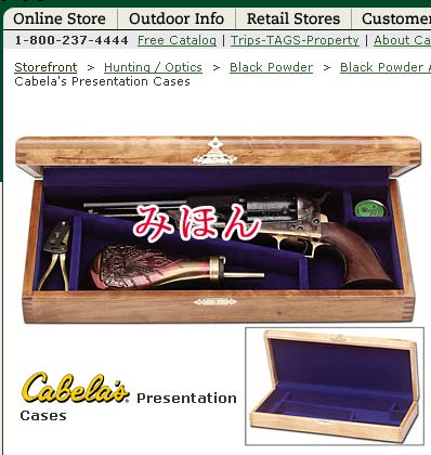 大好きになってしまった。しかもパーカッション式前装銃に興味を持った。 そして自然とフラスコ、モデルガン、ニップルケースと買って行き当然の結末として 木製ケースに手を出した。日本で売っているところが見つからないのでアメリカから購入する事とした。 前回も実績のあるCabela's のこちらのページの51ネービー用を頼んだ。↓ http://www.cabelas.com/cabelas/en/templates/catalog/store-home.jhtml 上記ページの「Hunting/Optics」→「Black Powder」→「Black Pawder Accessories」のページの 下のほうにある「Cabela's Presentation Cases」の中の一番最初に書いてある51ネービー用である。 ついでにレミントンのフラスコも頼んだ。