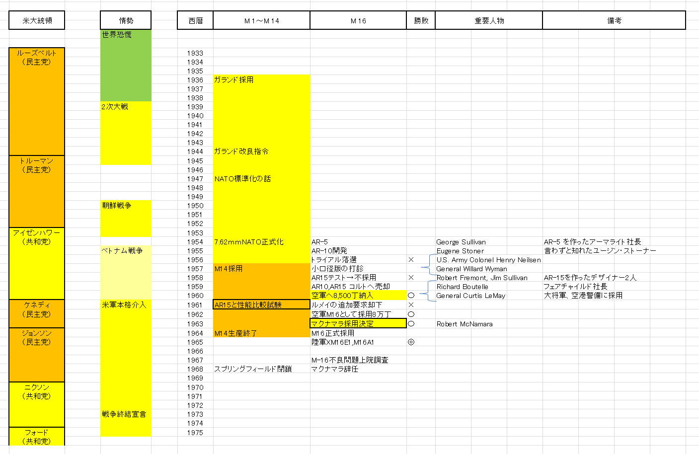 空軍からの絶賛と陸軍からの否定意見が両立する中、M-14 の生産も停滞し、ベトナム戦線は拡張していきます。 効率化、予算削減を目指すマクナマラは、AR-15 の採用とM-14 の生産停止を決断します。 空軍出身の彼には、陸軍の意見よりもかつての上司であるルメイ将軍の意見の方が通りやすかったのは想像に難くありませんが、 物事を効率的に整理しようとする彼の方針には、小口径高速弾を大量に持ち運び、フルオート射撃できるAR-15 は、 正当な評価としてM-14 よりも優れていると判断したのでしょう。