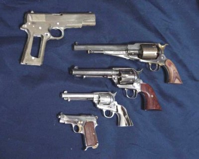 | 写真は見ての通りでフレームをニッケル、ハンマー・トリガー・ネジなど金(真鍮に見えるけど金メッキです)にしてみました。 スライドを付けてないのは薄すぎて裂けているところを何とか補修できないか考えているところなので・・・ロウ付けで肉盛りが出来るのか・・・検討中です。 |