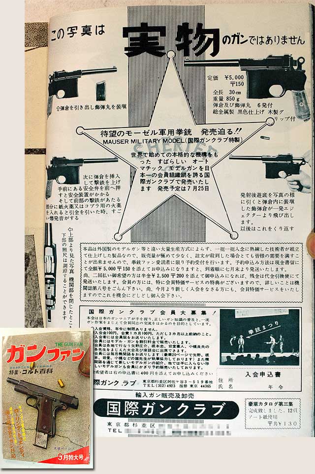 右写真は創刊号の国際ガンクラブの広告ですが、ヒューブレーの黒いものが売られています。メッキを落としてブルー処理した ものだと思います。MGCが作っていたのかもしれません。広告の表題にすでに「モデルガン」の言葉がみられます。MGCが言い出した言葉が広まりつつあります。