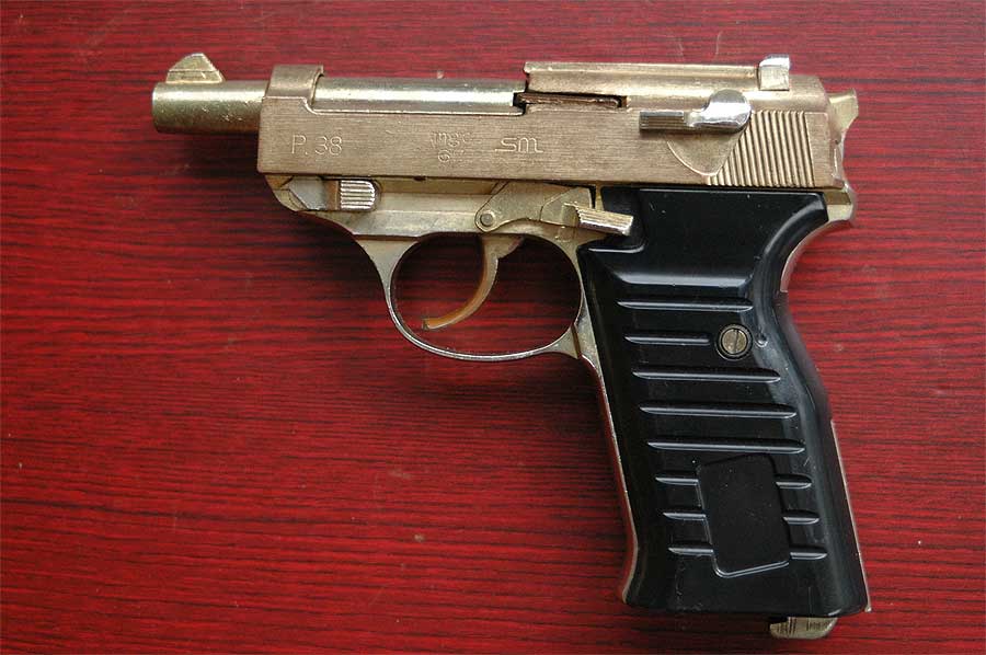 売るべき商品がなくなった中田商店は、早急にトイガンを作らなければなりませんでした。 そこで六人部氏が戦争博物館用に製作していたプラ製の拳銃を砂型に入れ アルミダイキャストモデル を急遽販売しました(亜鉛製との情報もあります)。