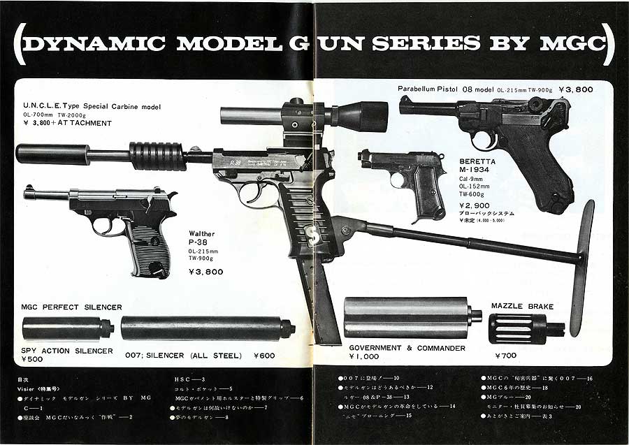 1966年になるとMGCは、ガバメントとHScの予告を行いますが、HScの方は先送りにされ 新たにダイナミックシリーズと銘打ちガバメント、ルガー、P38を順次発表します。特にP38は、当時人気のあったアメリカ製テレビドラマ「0011 ナポレオンソロ」に出てくるスパイ仕様で ストックなどの アタッチメント も発売されました。
