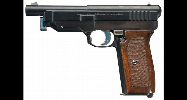 写真は、45ACP を撃てるモーゼル拳銃です。オープンスライドにロック部が補強されたスライドサイド面など