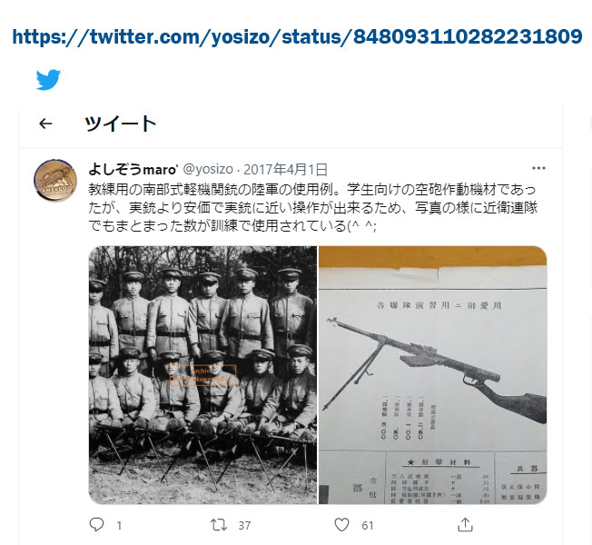 あるとき何気に南部式軽機関銃 と検索ワードを入れてみたら、この方のツィートに行き当たり