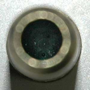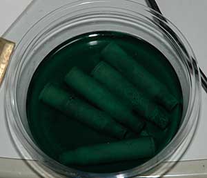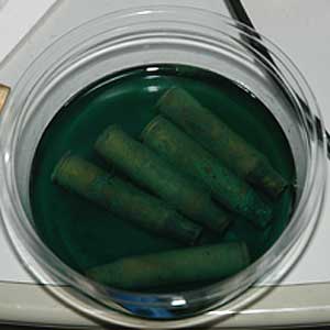 オークションで購入した緑青だらけの38式小銃弾の実物。 猛毒のように見える緑青は無害だという事が判っている。そうだろう、お城の屋根に 銅ぶきの瓦が使われているけれども、お城の周りに草木が生えないなんて聞いたことがない。 さっそく米酢に浸けてみた。浸けたとたんに小さな泡が発生。これは期待できる。 |