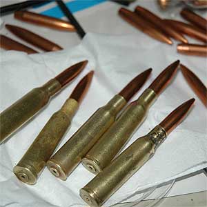 ノルマ社の物か?弾頭を叩き込む。 弾頭はノギスで測ったらオリジナルとほぼ等しいが、目で見ると少し太く見える。 |