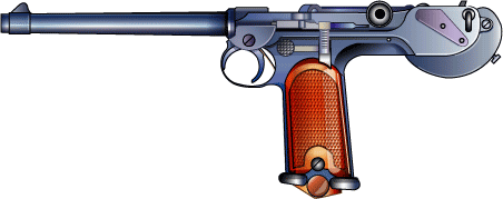 1893年特許。のちのLuger ピストルの原型。 ライフルに使われていたトグルアクションを拳銃に応用した。ショートリコイル。 銃身長7 1/4 、全長14インチ というから、かなりの大きさだった。 アメリカでは、木箱にホルスター付きのストック、予備弾装などが入ったセットで発売された。