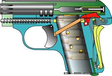 ちいさなボディに一式揃っている。 マガジンセフティ、グリップセフティ、マニュアル・セフティは黄色で描いてみた。