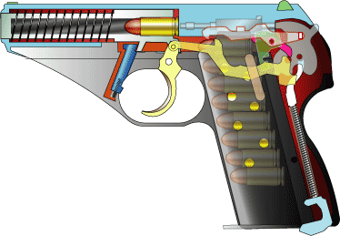 ワルサー社に対抗したのか、トリガーバー関係は左サイドに設置 トリガーバーは、ハンマーの回転軸より後ろ側をダブルアクションで引っ張るようになっている。 これって、ひき味悪いかもしれない。おかげでハンマーもでっかくなりフレーム後半部は 大きくなっている。トリガーバーにはディスコネクターが張り付いている。 分解ラッチはワンタッチでスライド、銃身を分解可能でPP を強く意識している。
