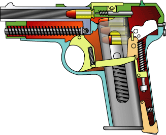 機構的には、のちの名銃1934とほぼ同じでストレートブローバック。ハンマー式。