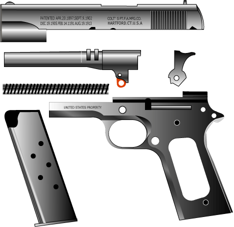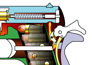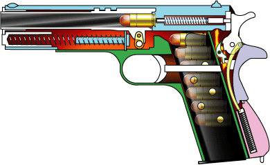 トリガーバーは、ディスコネクター下端を押す。ディスコネクターは図では赤枠のカキ色。 ディスコネクター下端はシアにほんの少しだけかかっているのでシアが回転しハンマーが落ちる。 弾丸が発射され後退したスライドにディスコネクタの頭は押さえつけられシアとの連絡が途絶える。 よって、フルオート射撃にはならなくてすむ。コネクトをディスエイブルするからディスコネクター。 ブローニングお得意の技。コルトM1900ですでに使用されている。