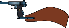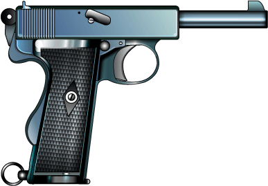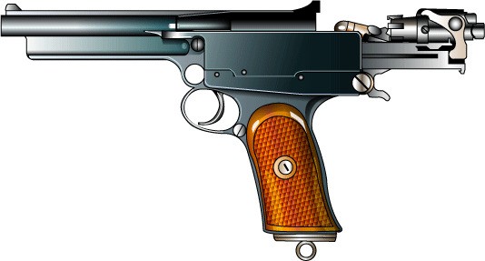 描いた。なんだか、ライフル銃の回転ボルト式のようにも見える。 ロングリコイルで8.5mm、9mm、45口径があったようだ。廃莢は真後ろに飛んだというが ちょっと良く判らない。 |