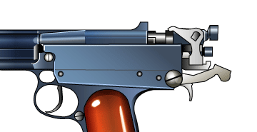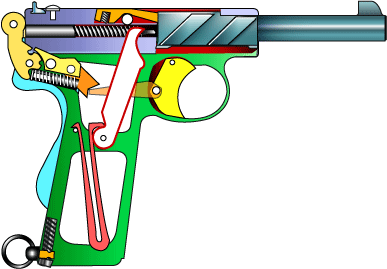 モデルガンのタニオアクションのようにレバーを介して松葉バネで行う。 ロックシステムは、銃身に斜めの凸が2本あり、フレームの凹と噛み合っている。 発射に伴うスライド後退により銃身はフレームの溝に沿って数ミリ下降・後退する。 スライドとの連結は現代の自動拳銃のロックと同じでご先祖様のようだ。