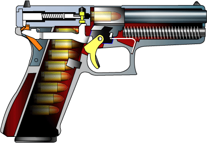 下方へ押しやられシアが外れる。コネクタは図ではオレンジ色。 コネクタはスライド突起により内側へ傾かされトリガーバーを再び上げる事によって ディスコネクターの役目もおおせつかっている。よく考えられている。 |