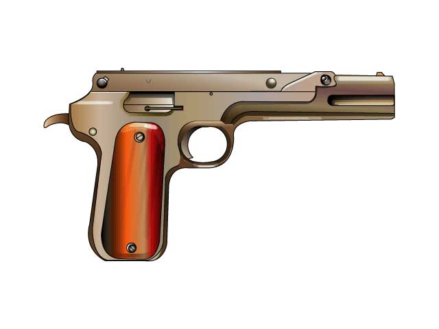 コルト・.38オート発売。アメリカ初の自動拳銃登場。 パラレル・ルーラー・ロッキング式。ガバメントのような リングが銃身の先端下部と薬室部の2箇所ある。 | us708794 |