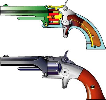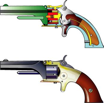 .22口径リムファイヤー・カートリッジ使用。 世界初の金属薬莢式拳銃。7連発。 学究肌のスミス氏と行動派で厳格なウェッソン氏が組んでS&W 社としてスタートしたのは 1854年。ロケット式のボルカニック弾を経て金属薬莢式弾薬の開発に成功する。 コルト社の回転拳銃のパテントが切れるのを待って満を持して新式弾とその発射銃モデル1が登場した。 リボルバーの雄S&W 社のスタートとなる。この弾は.22ショートとして現在も使用されている。 |