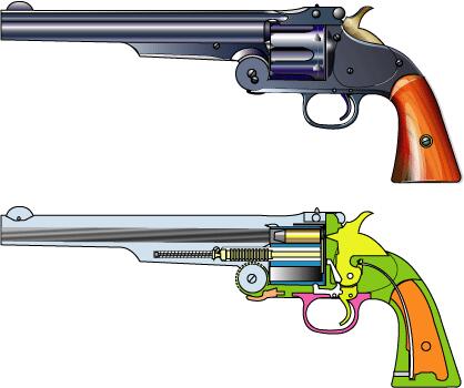 .44 SW センターファイアー、6連発。 大口径化のためフレームを強化しトップ・ブレイクとなった。当初リムファイアーで開発されたが 陸軍の要請により.44 SW センターファイアー弾使用となった。アメリカン・モデル。 カット図は、分解図を見て想像で描いたので不正確。