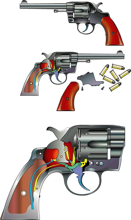 (現在のコルトとは反対)。板バネも2枚使用されていた。 1892年陸軍に採用されSAA の後継となるもフィリピンでの殺傷力の弱さから 45口径・自動拳銃へと変わってゆくことになる。