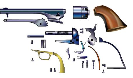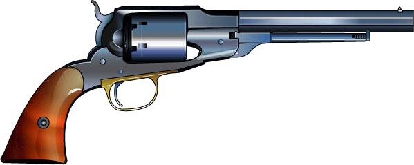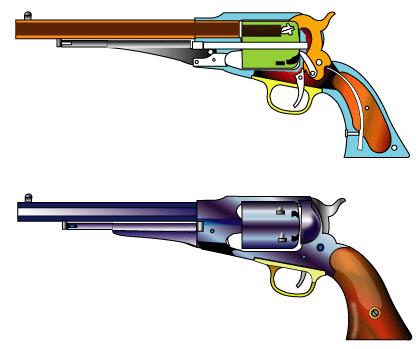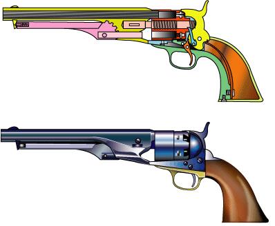 .44口径、6連発。 南北戦争で銃が足りずレミントンも大量に使用された。 この銃はコルトのオープンフレームと違い今日のようなソリッドフレーム採用。 しかしグリップ部分からすべてが一体であり製作しにくそうだ。 拡大図で水色の所が一体フレーム。グリップはコルトの一体型に対し2分割された。 以後、陸軍の推奨もあり、フレームが強固なソリッドフレーム銃の時代となる。 レミントン社は ELIPHALET REMINGTON の死後1900年ごろ破産し弾薬メーカに買い取られ現在に至る。 |