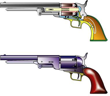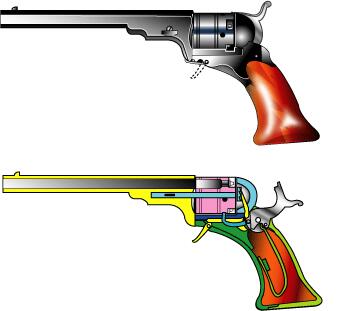 .31〜.36口径、5連発。若干22歳のサミュエル・コルトによる近代リボルバーの元祖。 パターソン市にパテントアームズ社を作るも1842年倒産。 価格が高く(ペッパーボックスの数倍)商業的には失敗した。 カット図を見れば判るがこの時代はシリンダーを銃身、リコイルプレートで挟んでいるだけ。 トリガーはハンマーをコックしたらフレームから降りてくる。ライフリングもあった? |