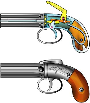 ETHAN ALLEN 氏によるペッパーボックスGun。 米国では、かなり有名らしく商業的にも成功した。様々なタイプあり。 ダブルアクション、シリンダー回転、シリンダー固定といったメカニズムを 含んでいた。カット図は想像でかなりいい加減。概念のみ得て欲しい。 ピンク色のピンは動かない位置。