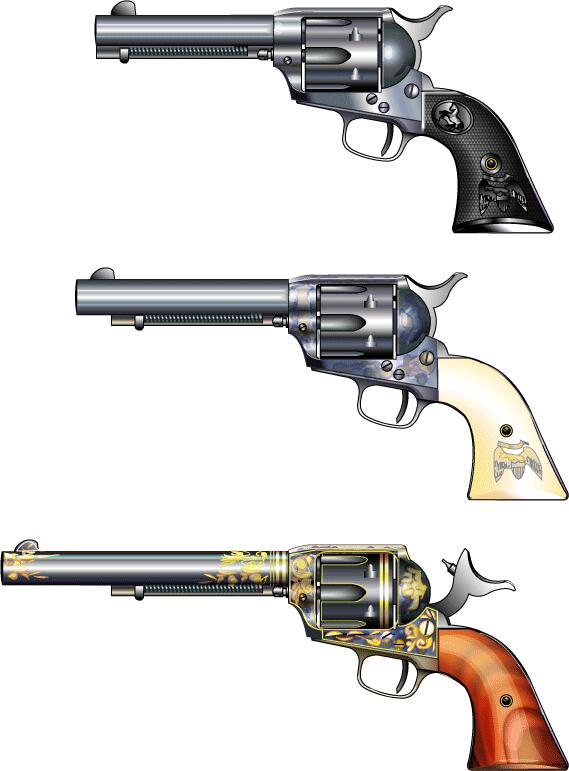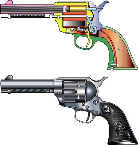 S&W 社の特許のおかげで金属薬莢式Gun を作れなかった。その間コンバージョンキットで凌いでいた。 世は南北戦争も終わり安定した東部から西を目指し大開拓時代の到来であった。 トライアルでS&W モデル3を降し陸軍制式拳銃となり20年間維持し続けた。ネイティブアメリカンとの 戦い、無法者の鎮圧などで世間ではピースメーカーと呼ばれた。 イラストは、のちの無煙火薬用強化フレームタイプ(ネジがある)。 |