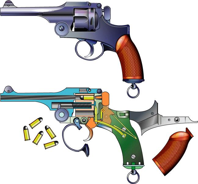 壱番型拳銃として導入された。弾薬も強化された。拡大図はラッシャン・セカンドモデル・日本海軍納入。 |