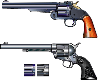 | 両方ともセンターファイアー、黒色火薬。 当然、赤い方がコルトSAA のシリンダーである。 |