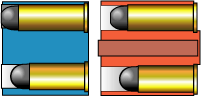 撃てなかったらしい。 SAA の方は両弾発射可能である。 イラストではギリギリ入りそうであるが、もともと正確には描いていないので参考程度にしてください。 もっとも、このころのシリンダーはカートのケース部分までシリンダーを削り込んでいたので、 まったく入らなかったであろう(弾頭部分から先が狭くなっている)。 |
