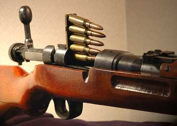 有煙火薬。クリップごと弾薬を装填し、撃ち終わるとクリップは下に落ちるようになっている。
