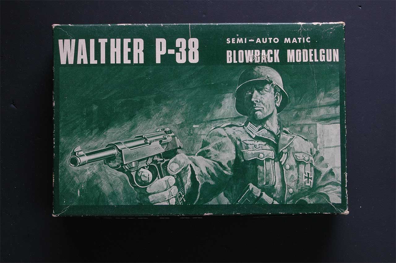 ちょっと脱線しますが、写真のようにCMCのp38は、46年規制の直前に発売されたため、黒いガス抜けタイプがありました。すぐに規制が来ましたので 少数しか売られていません。私も知りませんでしたが、写真を拝見させていただいたことがあります。紙箱の内側は発泡ではなく赤の布張りがなされていました。