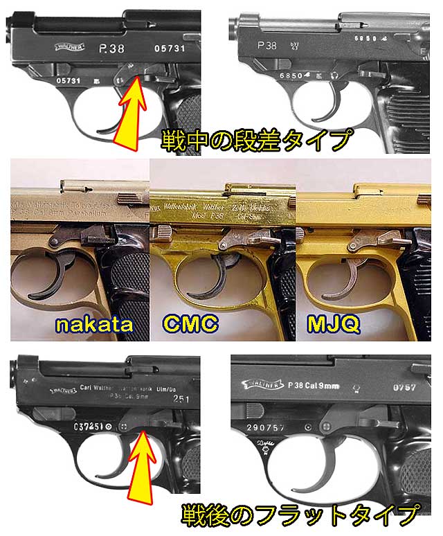 うむっ、鋭い指摘ですね、あそこの形状は中田の頃から見られますので中田モデルを開発中の作動テストの際にトリガーガード付け根が 折れてそこを補強した形に変更されたのかもしれませんね。だからのちのCMC、MJQも補強タイプに作った・・納得いく論理展開です。 貴重な、ご意見有難うございます。右の写真はクリック拡大します。MJQと実物フレーム写真を並べています。
