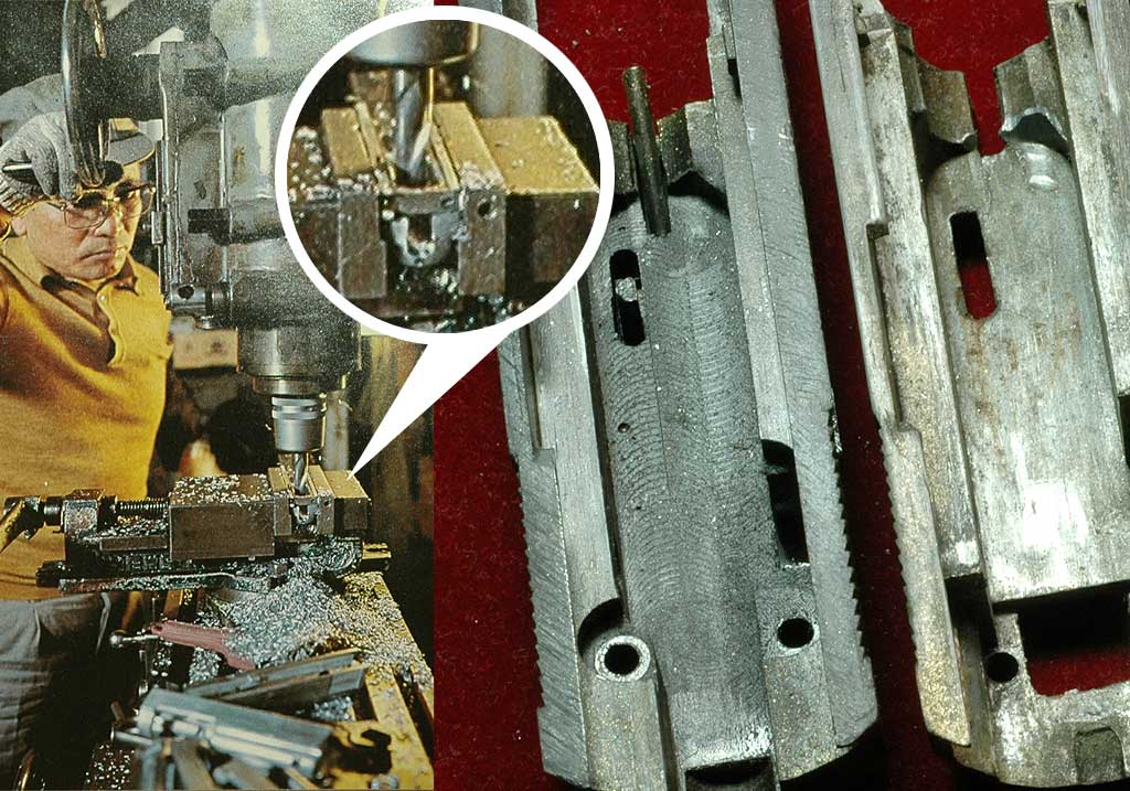 カタログの最後の方に、おっさんがP38 のスライドをフライス盤で切削しています。 もしかして、と思い分割式をバラしたらやはり切削加工は行われていません。 写真の右が分割型で底がツルツルです、左の一体型はエンドミルの刃物跡が往復でくっきりと残っています。