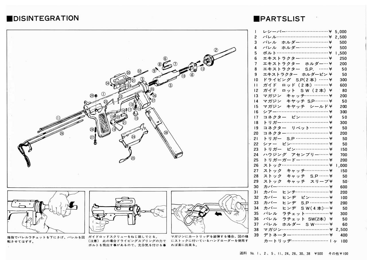 ハドソンのグリースガンといえば、プラスチック製ブローバックを 連想する人が多いと思いますが、その昔は鉄製のモデルガンを 作っていました。また、プラ製ガスガンもあったようですが性能が悪かったそうです。 ハドソンがモデルガン化したものは、チャージングハンドルのないM3A1型です。 写真は、取説・分解図の表紙ですが、よく見ると左右が反転していますね。