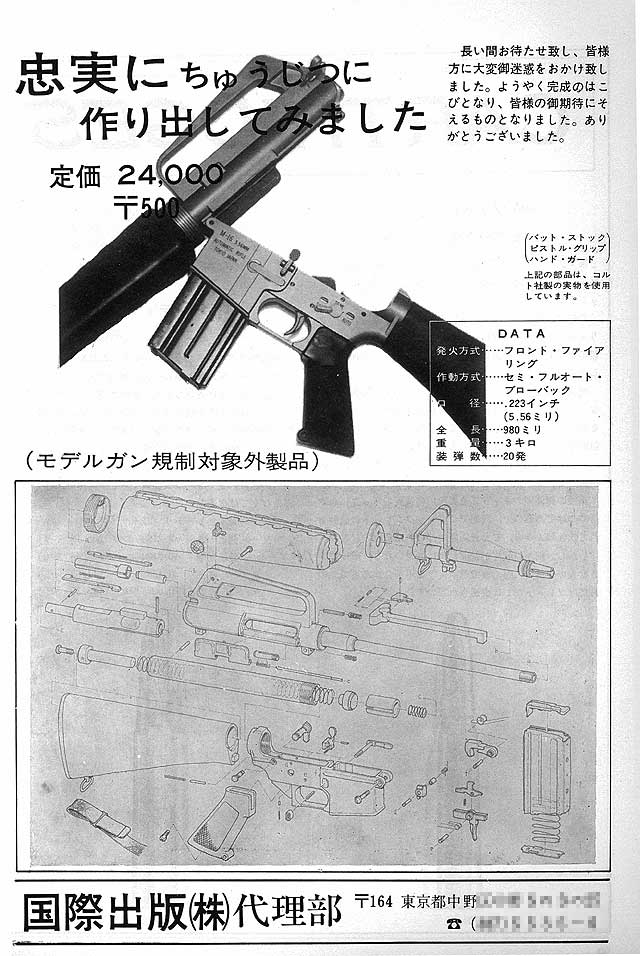 当初の登場広告には、ハンドガードやストックは実物用を使用すると謳っていましたが、実際に そのバージョンが発売された物かは知りません。のちの製品は普通に国産のパーツが使われています。