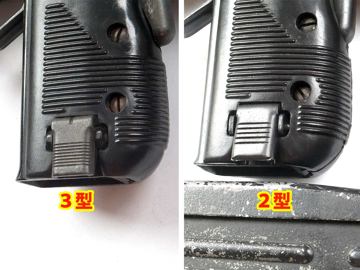 3型では、リアサイト形状の外観がネジが無くなって実銃っぽくなったこと、マガジンがダブルカアラムになったこと、また材質ではボディが亜鉛からアルミに代わって、軽量化されたことなどが それまでと大きな違いになります。またボルトも当初は鋳鉄製でしたが、そのうち亜鉛製になり、後期には 一体式ではなく打撃部分がパーツ分けされています。