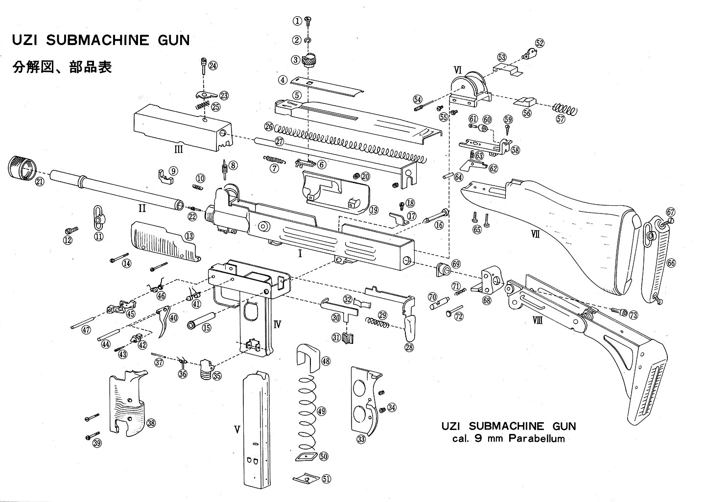 分解図は初期型の物でチャンバーとバレルが一体で、ボルトも一体型のようです。