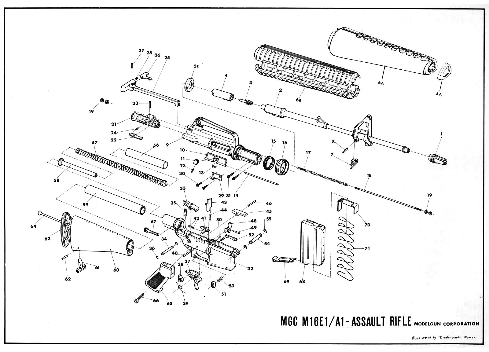 実物のM16 が反動を極力感じさせない作りになっているのに対して、MGC のモデルガンは、全く逆に 反動をなるべく感じるように作られています。ストックの中をおおきく前後するハンマーがそれです。 なかなかグッドアイデアです。