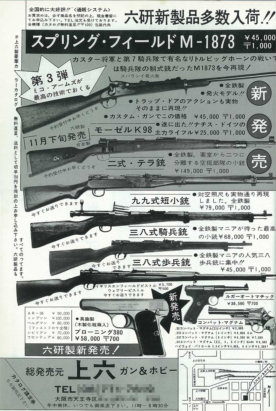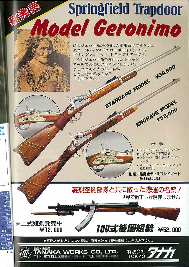 Gun誌の広告から見ますと、最初は普通の騎兵銃が発売され、翌年にジェロニモの2タイプが販売されました。 さらに翌年には、10cm長いライフルタイプも販売されました。これはレアですね。なかなか見ることは 少ないモデルでしょうね。 いずれもチェッカー入りストックの仕上げはたいへん良かったそうです。↓クリック拡大します。