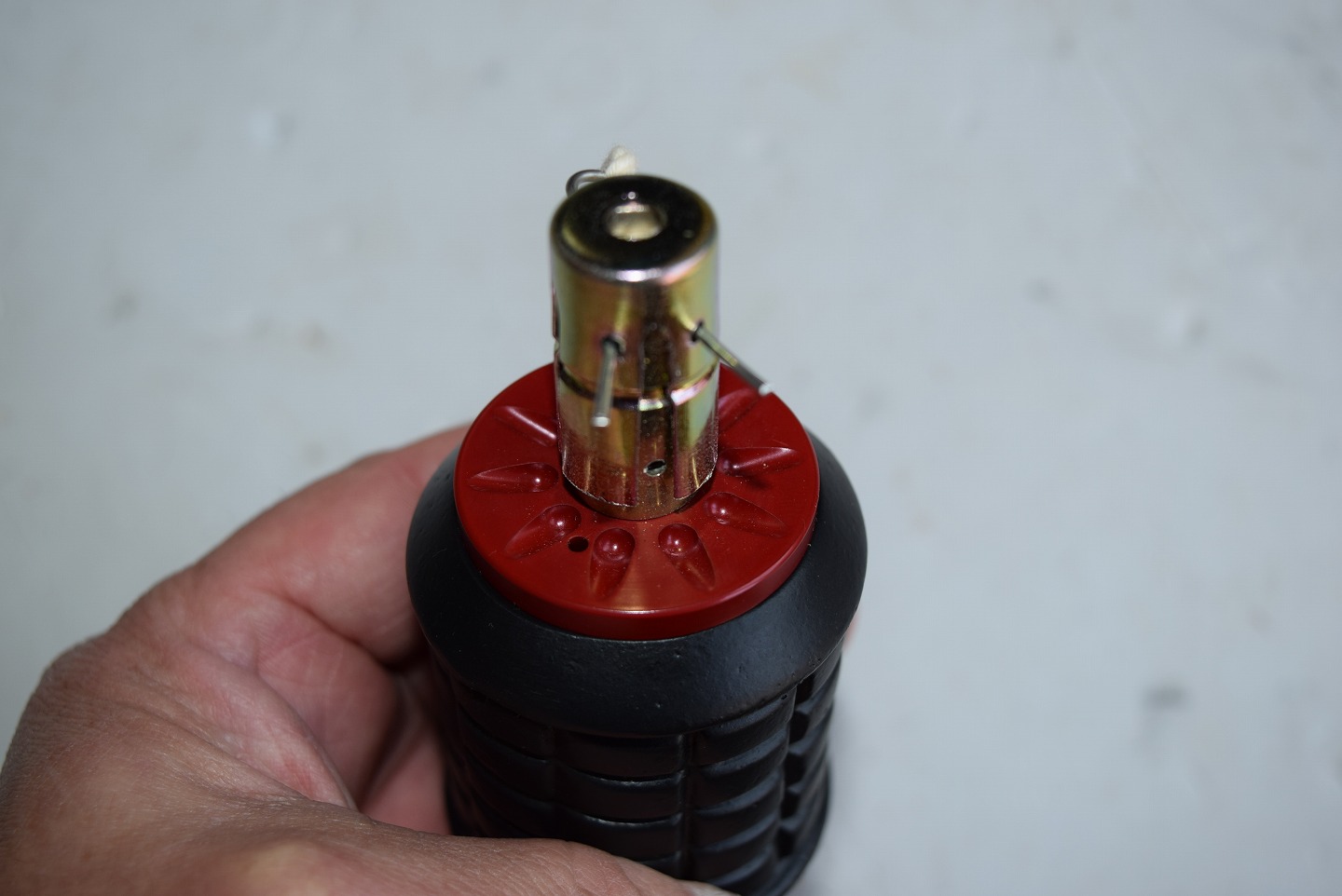 亜鉛合金?製のようですが、そこそこ重いです。偽物である明示なのか、重さ調整なのか底に穴が開いています。 また、右写真のように首のガスが噴出する穴まできちんとコピーされています。 投げる前にガスでやけどする可能性があるグレネードって日本製だけだったのではないでしょうか?