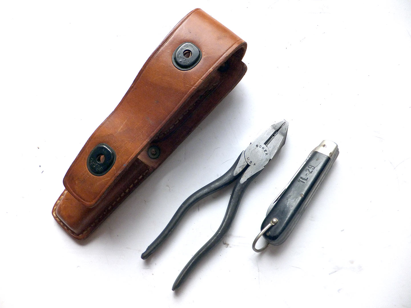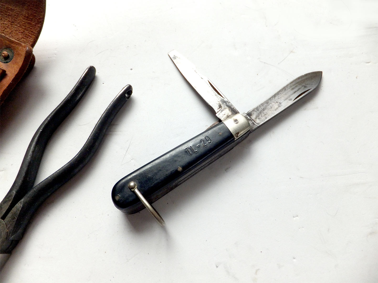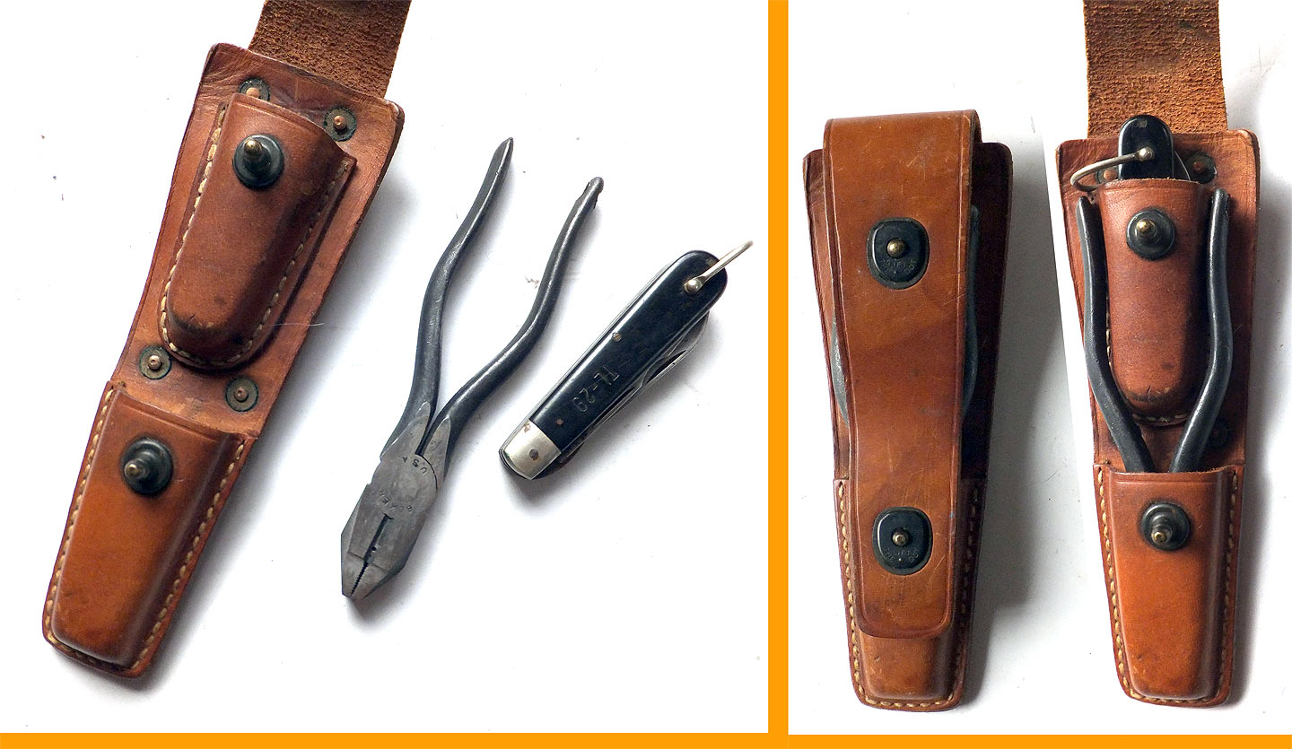 米軍の通信兵用ツールキットです。戦後のレプリカ品です。 CS-34 が革ポーチでTL-29 が電工ナイフ、TL-13 がプライヤーらしいです。 全部合わせてTE-33 ツールキットと呼ぶようです。
