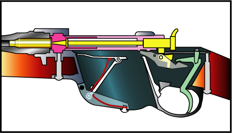 モーゼルなどに比べて閉鎖性、安全性は少し落ちる。 図では茶色でマガジンフォロアーにかかる板ばねを描いている。2枚ある。トリガー前方には クリップキャッチを白色で描いている。