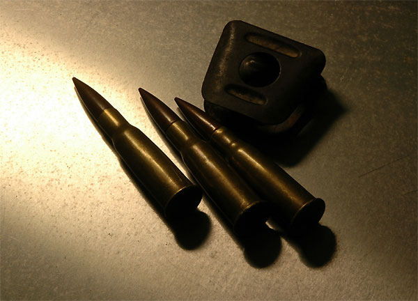 ![]() 8mmレベル弾は11mmのグラー弾に比べるとずいぶんとスリムになっているが、 それでも隣に置いた30-06弾と比較するとずいぶんとずんぐりむっくりである。 2弾絞りのケース形状からミルクビンと呼ばれた。