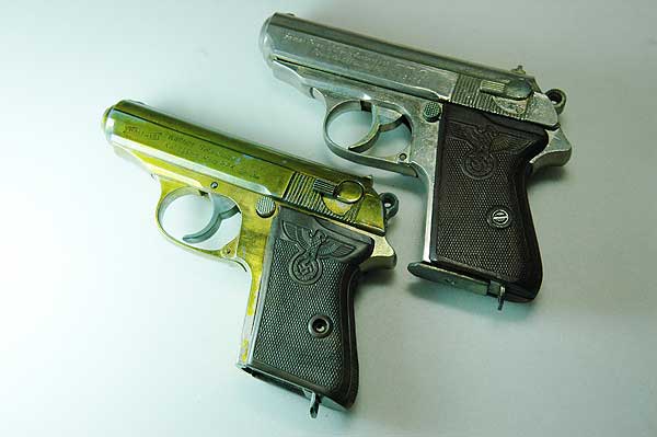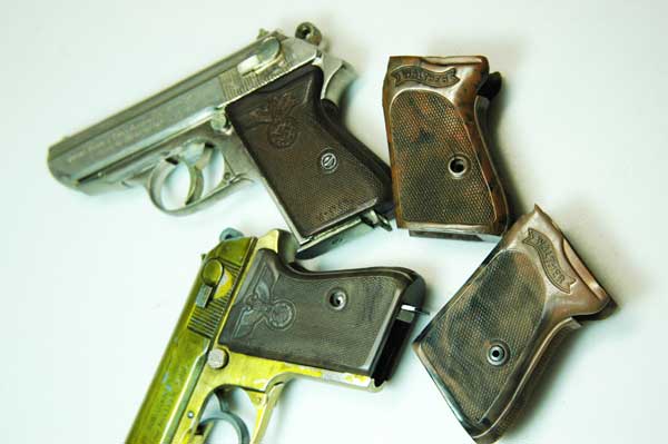 対して右の二つは、このように金属板は埋め込まれていない。 また、材質も柔軟性があるものでモデルガンに使用するにはレプリカ品のほうが良い。 はめ込みやすい。 1968年のロバート・ケネディ暗殺事件まではPPK もアメリカで普通に売られており、米国の会社で大量に戦前タイプのワンピースグリップが複製されたらしい。また、 面倒な事に レプリカグリップにも金属板が入っている物も存在する。購入の際には手にとって見るしか 真贋は付けがたいであろう。注意が必要だ。