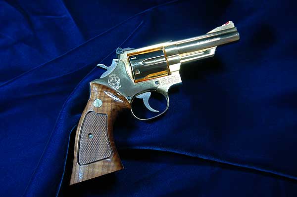 オールドタイプといってもダイヤモンドチェッカーでは無い。 スピードローダーの切り欠きが無いタイプだ。 S&W のグリップの色は、おおむねこのような黄色系であるが、下に出てくる赤系もあるのを最近知った。