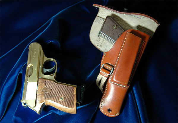 このホルスターにモデルガンを入れてみた。 MGC のPPK は写真のように収められるが、左のマルゼン+ZEKE のものは入らない。 マルゼンのガスガンは、実物よりもフレームが2〜3ミリ厚いと思う。