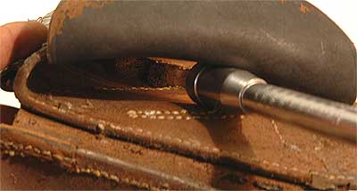 本当に100年物か? シリンダーの痕跡がまったくない。おそらく銃が入れられた事は無いのであろう。 クモの巣やゴミがいっぱい。 よく見ると木だと思い込んでいた内部スペーサーは厚い皮を3枚張り合わせたものだ。