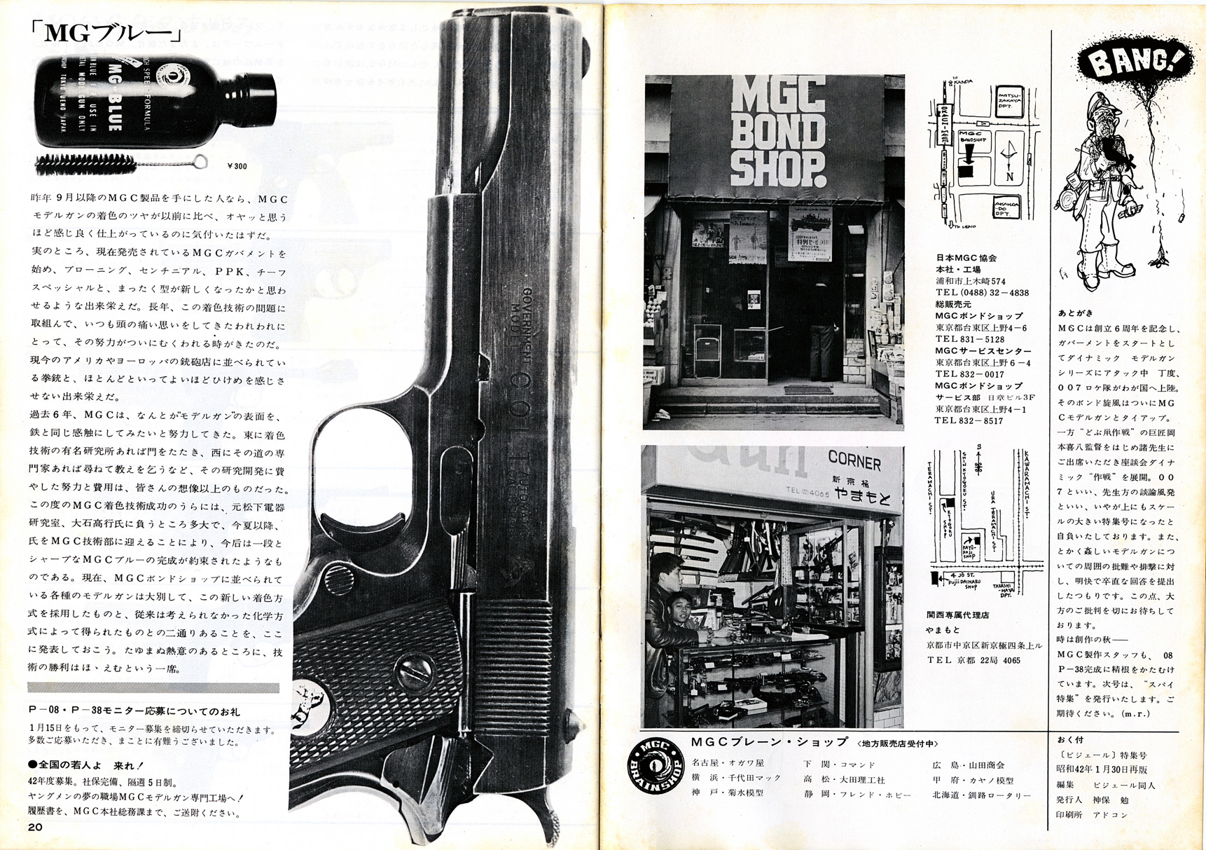 基礎知識1961年に貿易自由化され、大量にアメリカからキャップガンが輸入されました。中田商店によるものです。 それをコピーし改造し、よりリアルな物を製造しだしたのが神保氏のMGC でした。キャップガンとは違うんだという意気込みから、それらを「モデルガン」と呼びました。MGC 製品は、市場独占で日本製モデルガン=MGC 製という状況でした。 販売は、コクサイ、マルゴー、江原商店(CMC)、本流、マルホコルト(堀内商店)などで、MGC は販売はしていませんでした。 1965年、画期的新製品ブローニング380の発売に際し、MGC は、住民票の提出を義務付けます。 これは、発禁も食らったことのあるMGC がトイガンの将来を危惧してのことでした。伏線はこの年の実銃乱射事件による警察の一方的な 銃刀法改正が行われたことでしょう。社会に溢れるようになった モデルガンの行く末を案じたのだと思います。賛同しないと品物を卸さないという強硬姿勢でした。 ところが、販売店側はこれに猛反発、しかも直営店まで出すというMGC とは、完全に絶交状態になります。 反MGC 連合はコクサイの荒井新一郎氏を中心に打倒MGC を掲げ「高級玩具組合」を設立します。 MGC 製品がないと売るものがない組合側は、MGC 製品の丸ごとコピー品を許可なく製造販売し始め、ここに 15年にわたる「仁義なきモデルガン戦争」が始まったのでした。 1968年ビジェールは1967年印刷のようです。モデルガン戦争まっただ中の頃です。